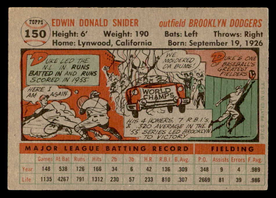 1956 Topps Baseball #150 Duke Snider Dodgers EX-MT Gray 539123