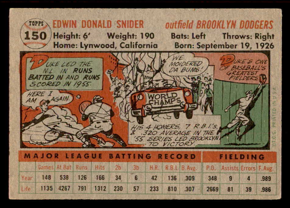 1956 Topps Baseball #150 Duke Snider Dodgers VG-EX Gray 539067