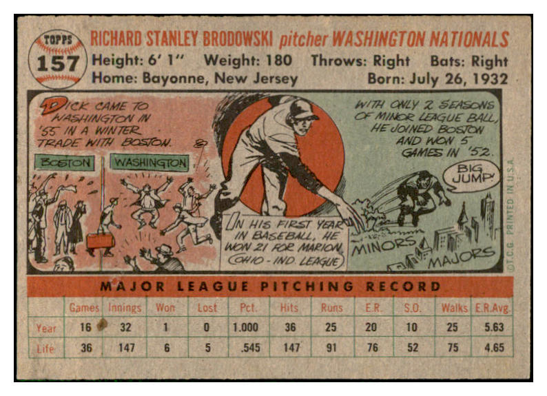 1956 Topps Baseball #157 Dick Brodowski Senators EX-MT Gray 535178