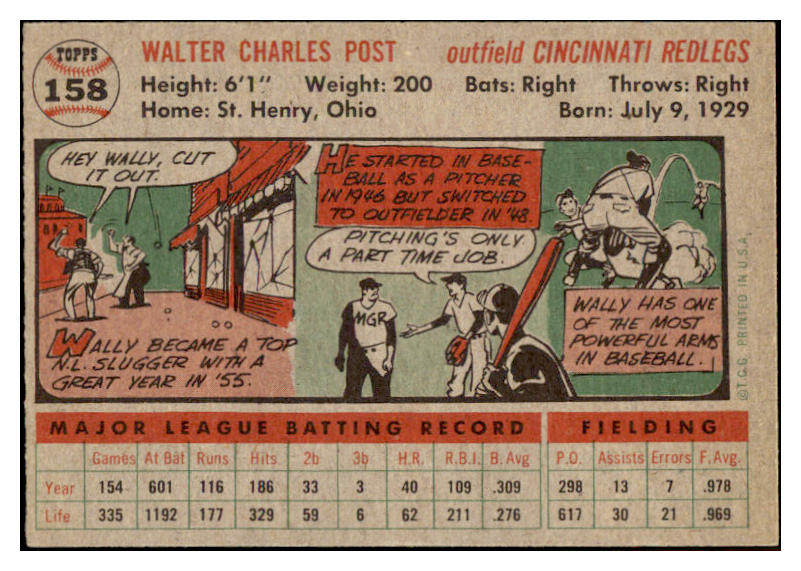 1956 Topps Baseball #158 Wally Post Reds EX-MT Gray 528215