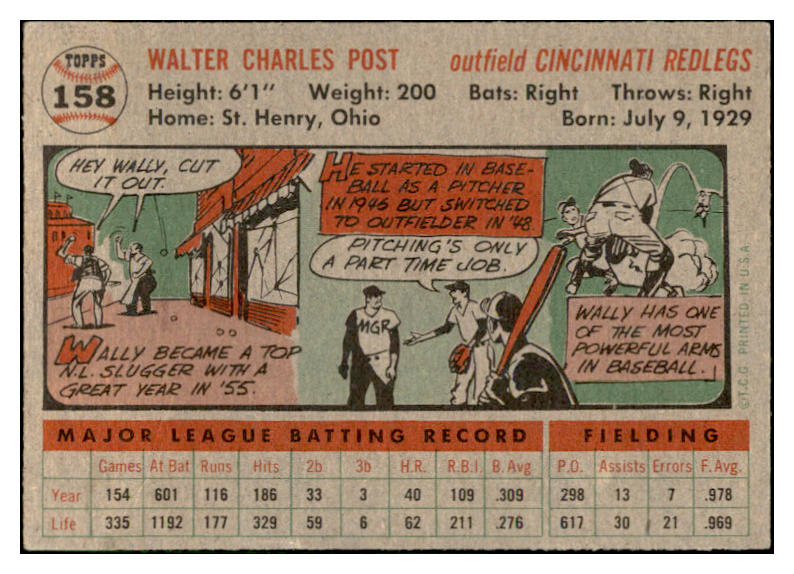 1956 Topps Baseball #158 Wally Post Reds EX-MT Gray 535179