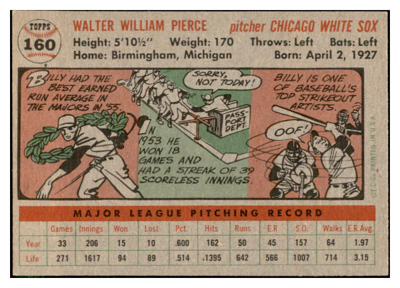 1956 Topps Baseball #160 Billy Pierce White Sox EX-MT Gray 535181
