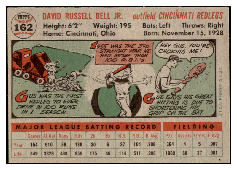 1956 Topps Baseball #162 Gus Bell Reds EX-MT Gray 528442