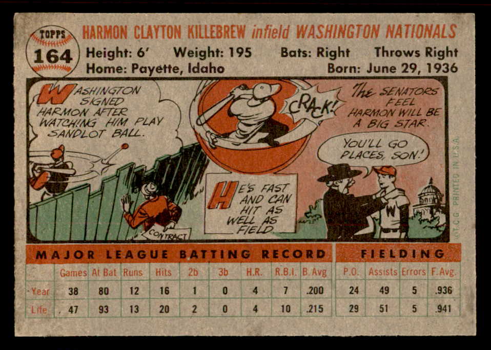 1956 Topps Baseball #164 Harmon Killebrew Senators EX+/EX-MT Gray 539060