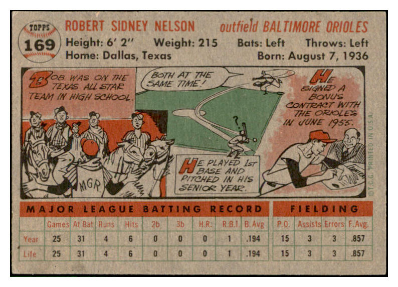 1956 Topps Baseball #169 Bob Nelson Orioles EX-MT Gray 535193