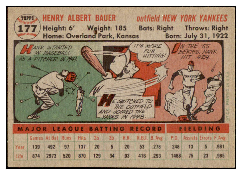 1956 Topps Baseball #177 Hank Bauer Yankees EX-MT Gray 527998