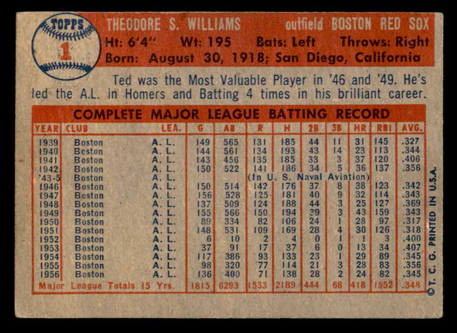 1957 Topps Baseball #001 Ted Williams Red Sox VG-EX 538438