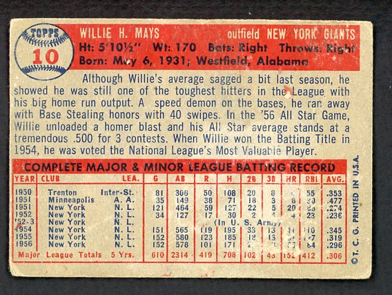 1957 Topps Baseball #010 Willie Mays Giants VG 541275