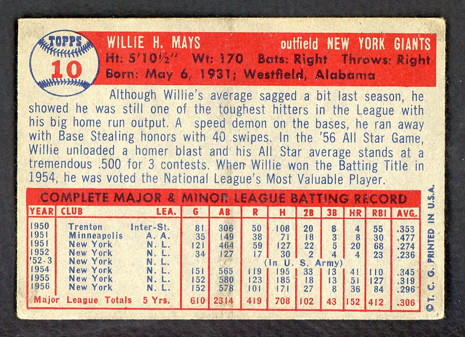 1957 Topps Baseball #010 Willie Mays Giants VG-EX 543292
