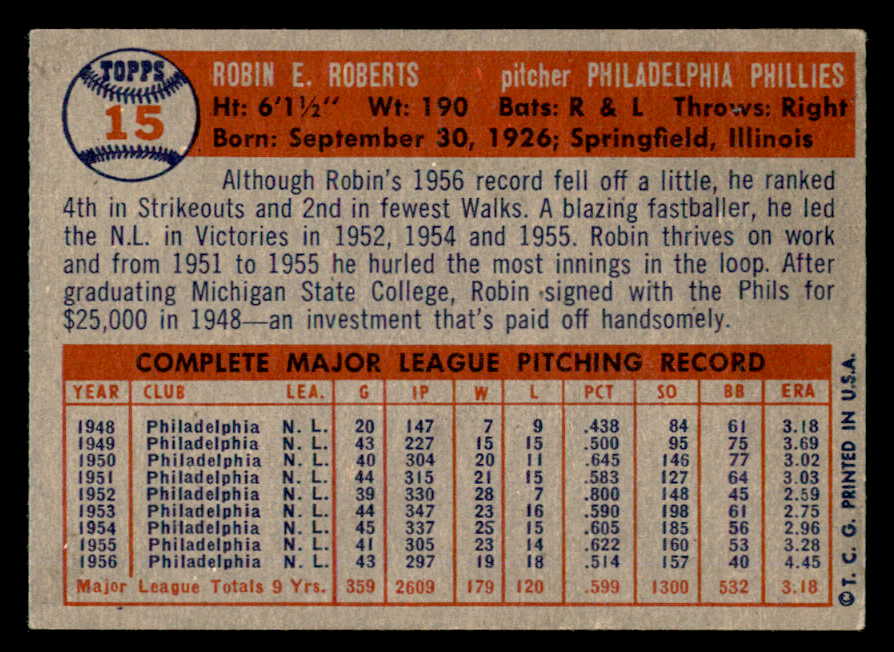 1957 Topps Baseball #015 Robin Roberts Phillies EX-MT 540110