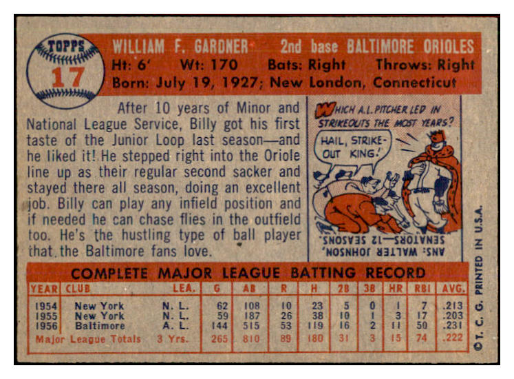 1957 Topps Baseball #017 Billy Gardner Orioles NR-MT 534881