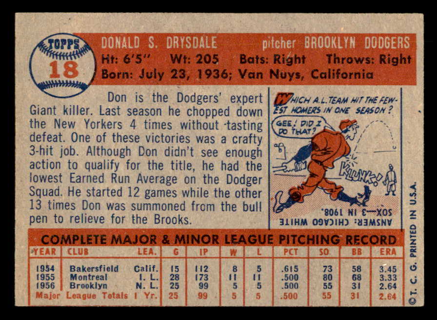 1957 Topps Baseball #018 Don Drysdale Dodgers EX-MT 547213