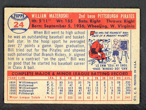 1957 Topps Baseball #024 Bill Mazeroski Pirates EX 541269