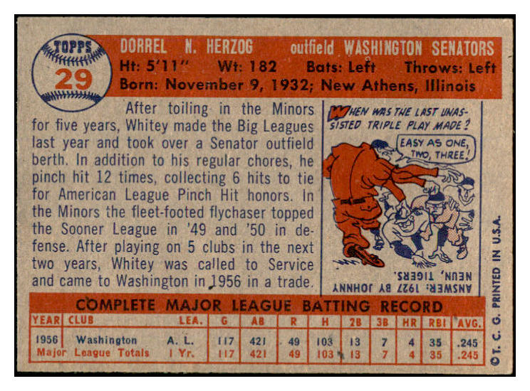 1957 Topps Baseball #029 Whitey Herzog Senators EX-MT 532473