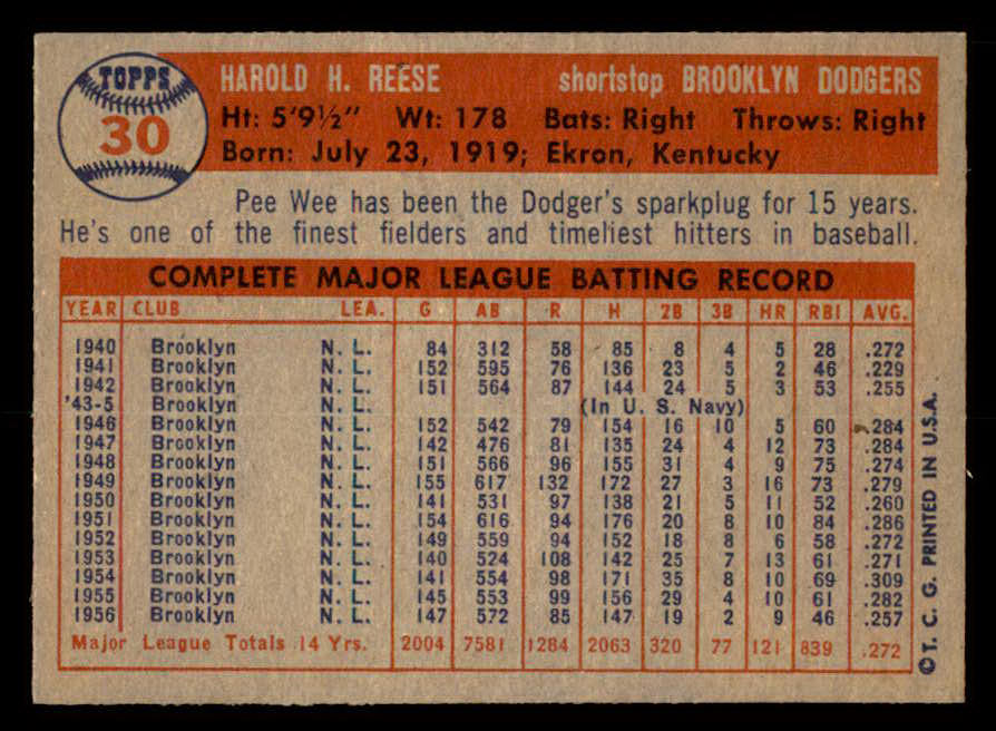1957 Topps Baseball #030 Pee Wee Reese Dodgers NR-MT 539548