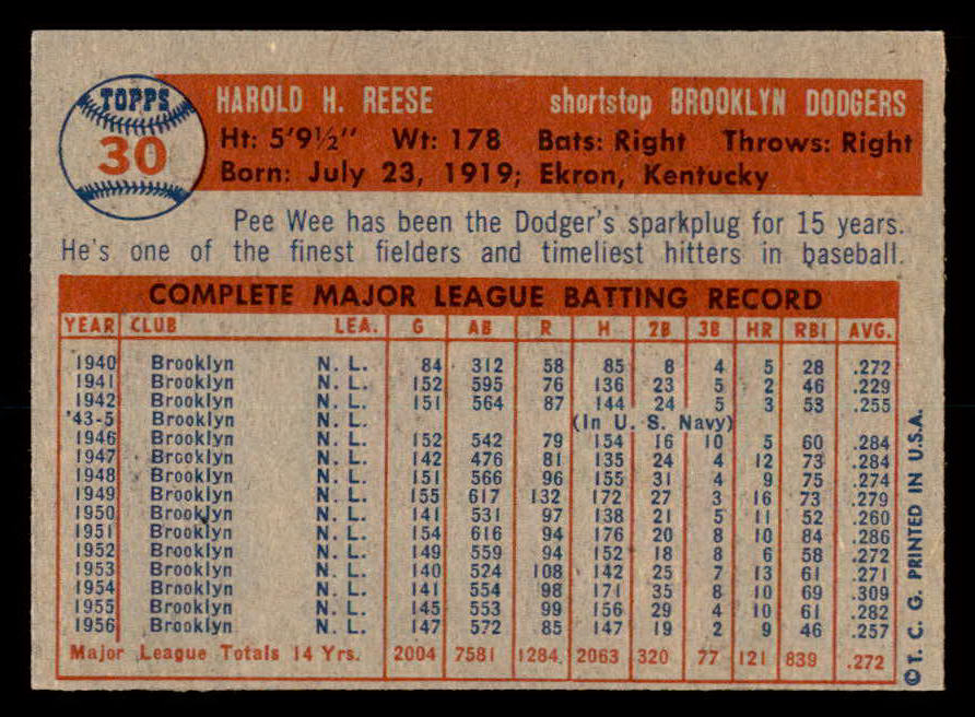 1957 Topps Baseball #030 Pee Wee Reese Dodgers NR-MT 539549