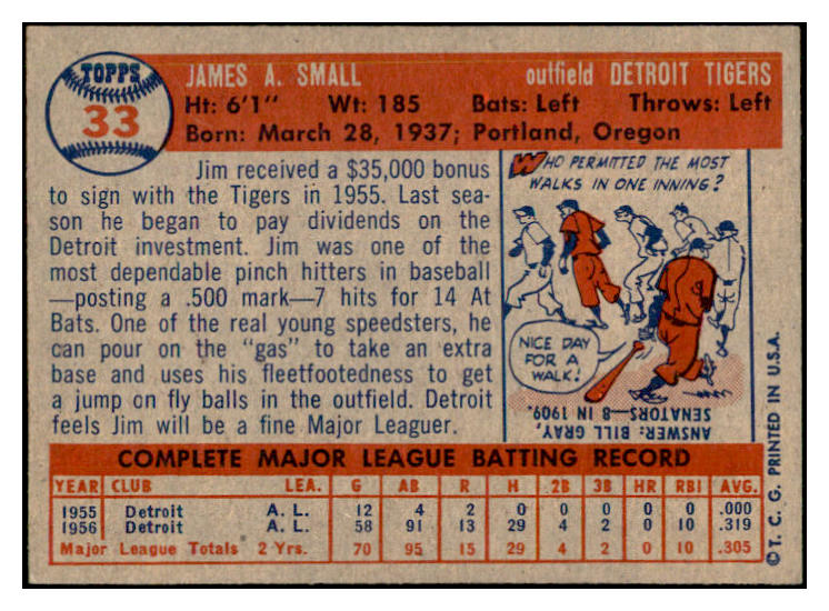 1957 Topps Baseball #033 Jim Small Tigers EX-MT 535403
