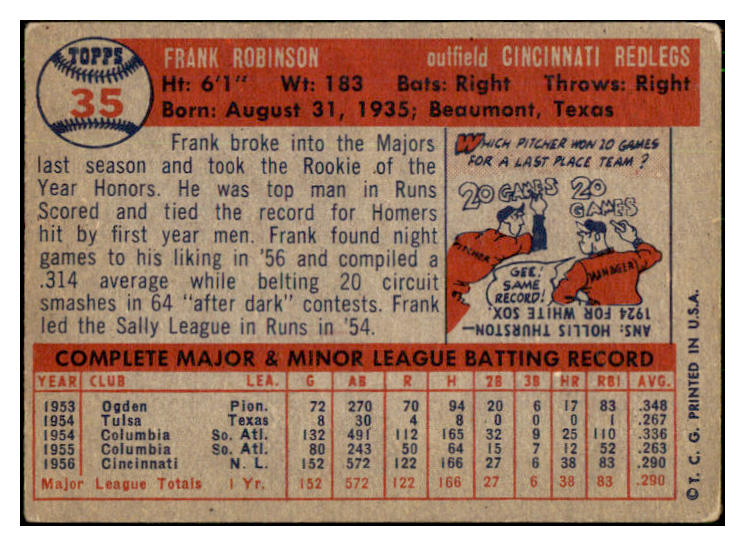 1957 Topps Baseball #035 Frank Robinson Reds VG-EX 441556 Kit Young Cards