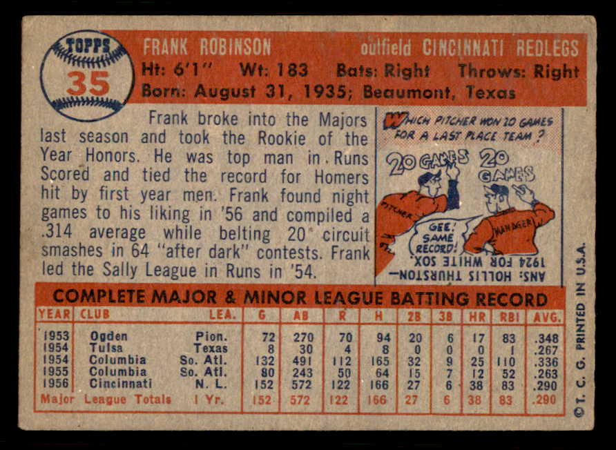 1957 Topps Baseball #035 Frank Robinson Reds VG-EX 543254