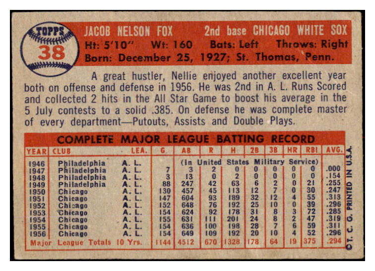 1957 Topps Baseball #038 Nellie Fox White Sox VG 530534