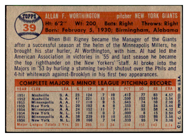1957 Topps Baseball #039 Al Worthington Giants EX-MT 535404