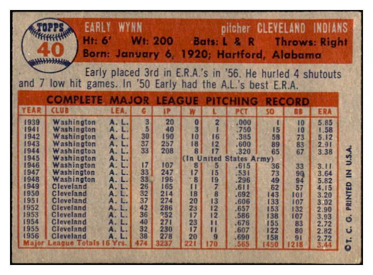 1957 Topps Baseball #040 Early Wynn Indians EX-MT 532468