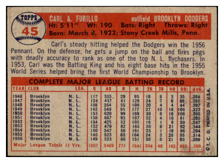 1957 Topps Baseball #045 Carl Furillo Dodgers EX 523776
