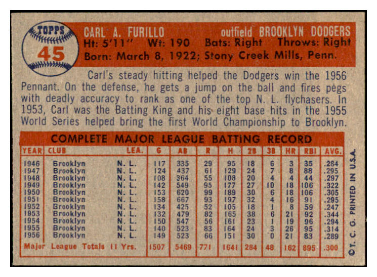 1957 Topps Baseball #045 Carl Furillo Dodgers EX-MT 532484
