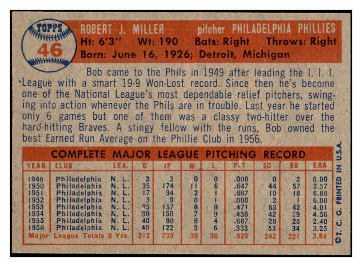 1957 Topps Baseball #046 Bob Miller Phillies EX-MT 535407