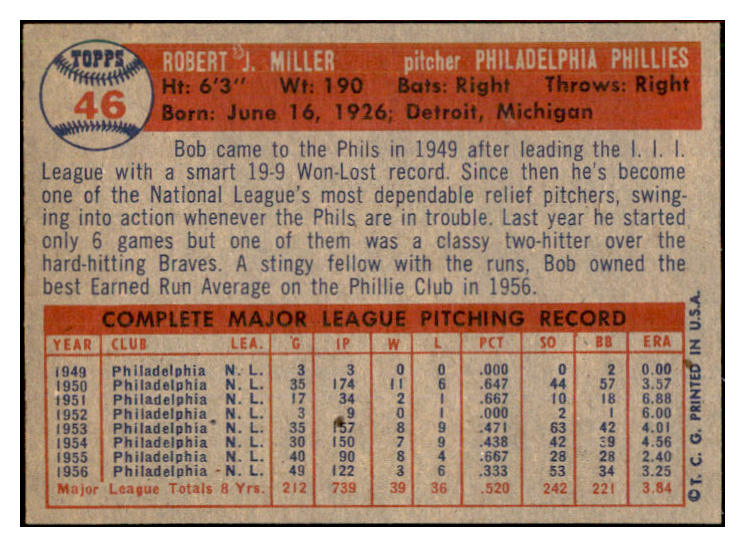 1957 Topps Baseball #046 Bob Miller Phillies NR-MT 534885