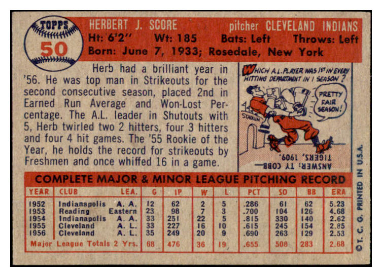1957 Topps Baseball #050 Herb Score Indians EX 525011