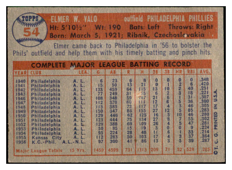 1957 Topps Baseball #054 Elmer Valo Phillies EX-MT 535411