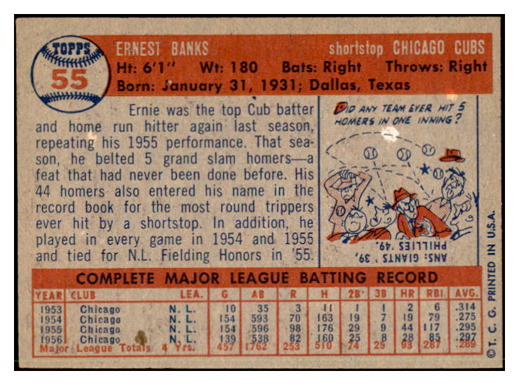 1957 Topps Baseball #055 Ernie Banks Cubs EX-MT/NR-MT 537411