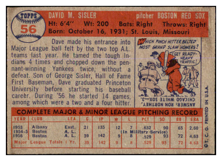1957 Topps Baseball #056 Dave Sisler Red Sox EX-MT 527673