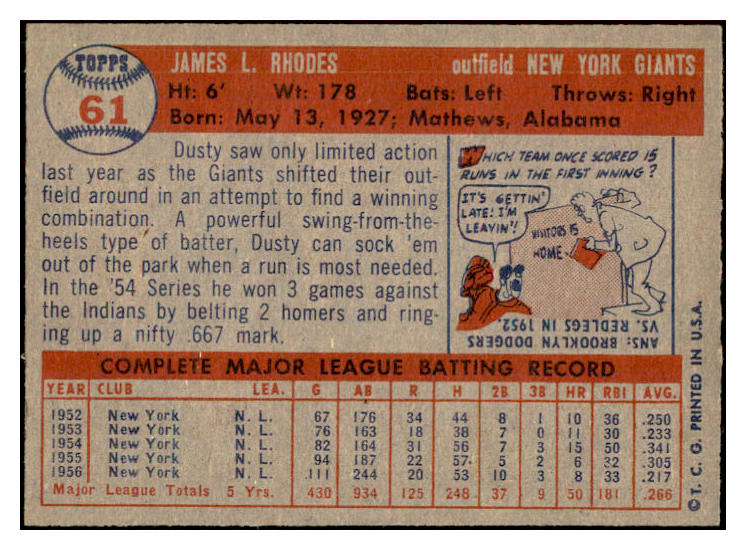 1957 Topps Baseball #061 Dusty Rhodes Giants NR-MT 534867