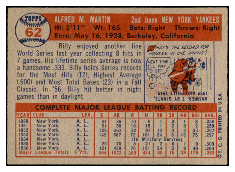 1957 Topps Baseball #062 Billy Martin Yankees EX+/EX-MT 532515