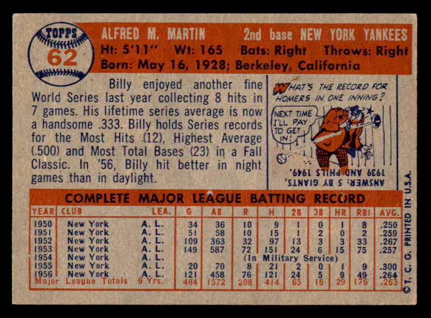 1957 Topps Baseball #062 Billy Martin Yankees VG-EX 540076