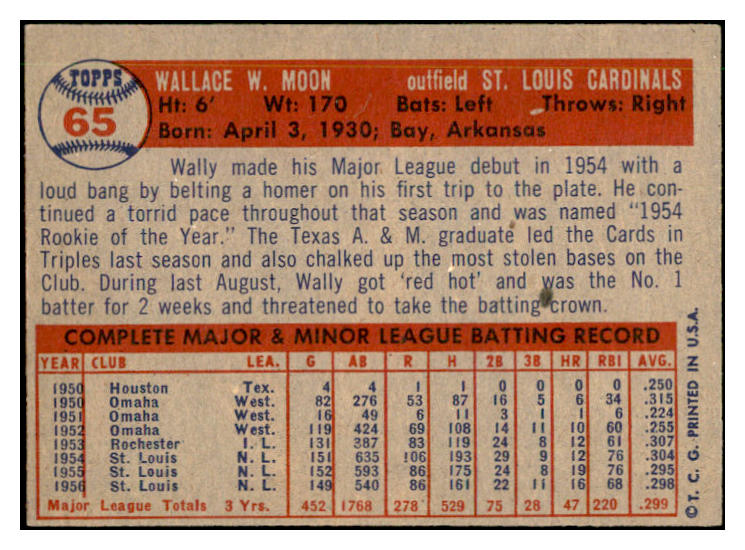 1957 Topps Baseball #065 Wally Moon Cardinals EX-MT 535417