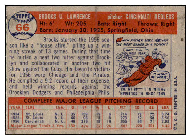 1957 Topps Baseball #066 Brooks Lawrence Reds EX-MT 533812