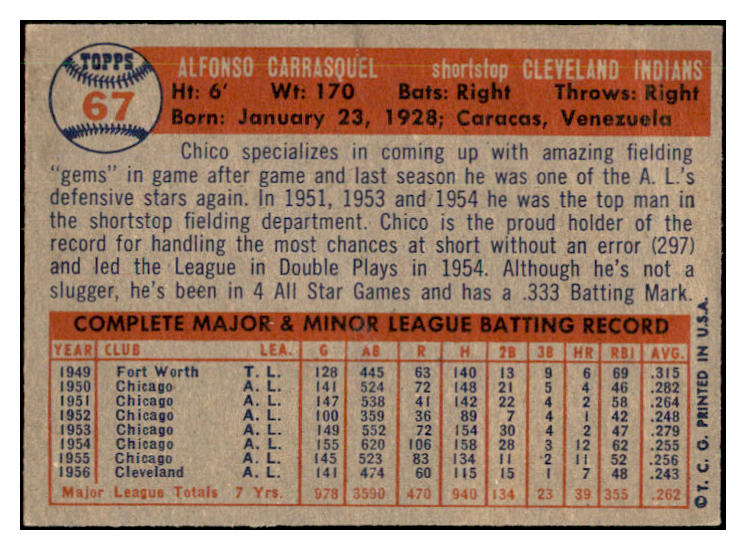 1957 Topps Baseball #067 Chico Carrasquel Indians EX-MT 535419