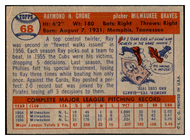 1957 Topps Baseball #068 Ray Crone Braves EX-MT 535420
