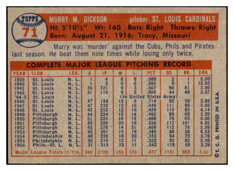 1957 Topps Baseball #071 Murry Dickson Cardinals EX-MT 535421