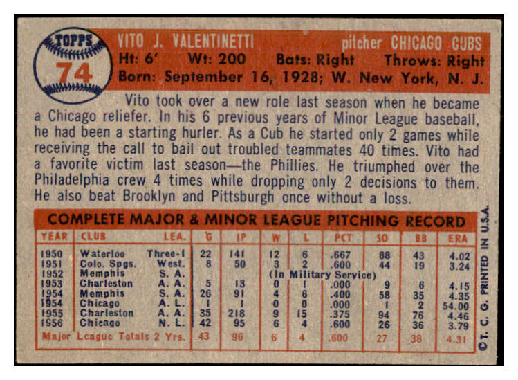 1957 Topps Baseball #074 Vito Valentinetti Cubs EX-MT 534947