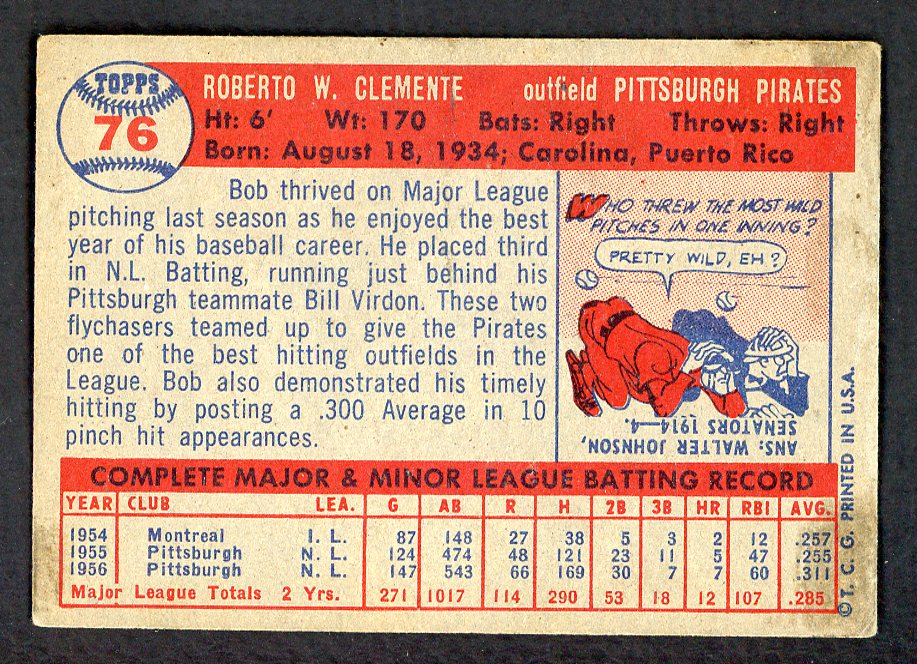 1957 Topps Baseball #076 Roberto Clemente Pirates VG-EX 543295