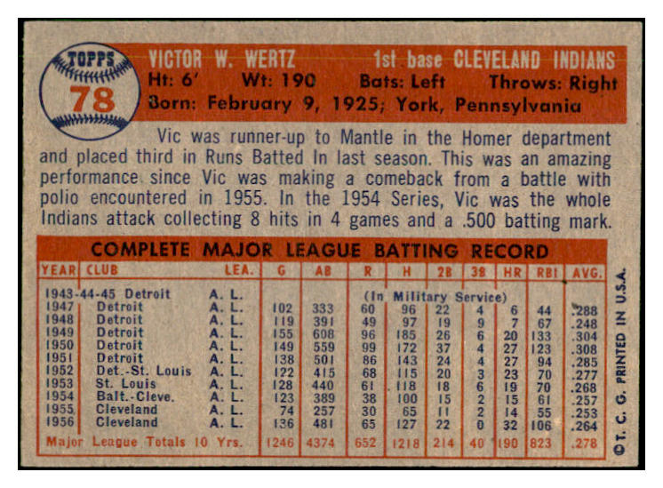 1957 Topps Baseball #078 Vic Wertz Indians EX-MT 535424
