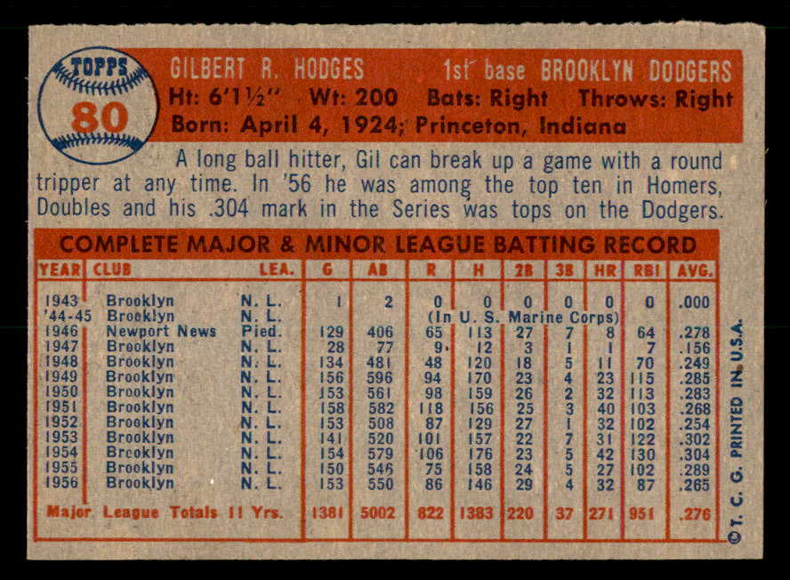 1957 Topps Baseball #080 Gil Hodges Dodgers NR-MT 539541