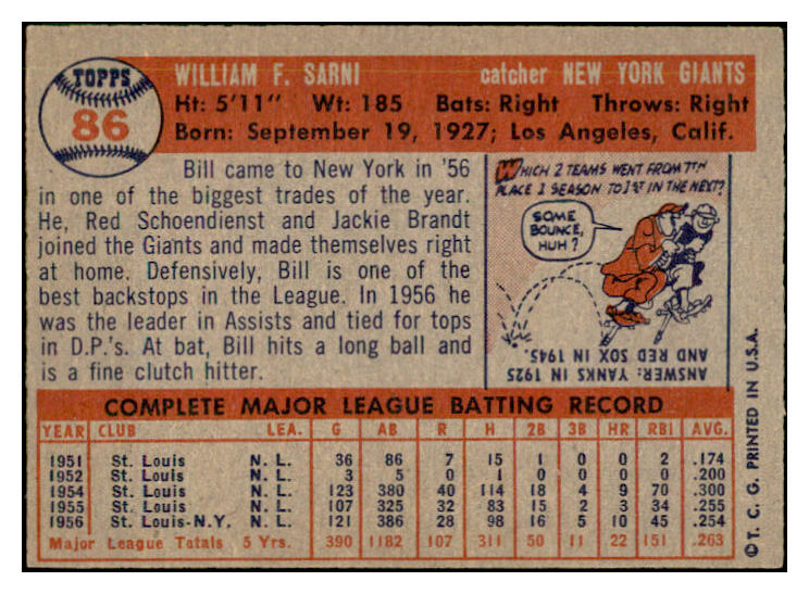 1957 Topps Baseball #086 Bill Sarni Giants EX-MT 535428