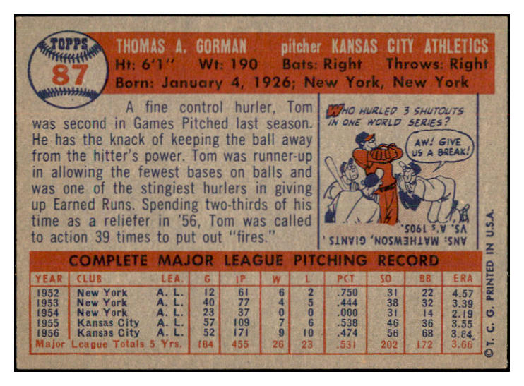 1957 Topps Baseball #087 Tom Gorman A's EX-MT 534946