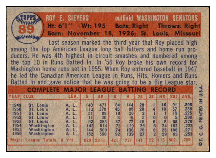 1957 Topps Baseball #089 Roy Sievers Senators EX-MT 533799