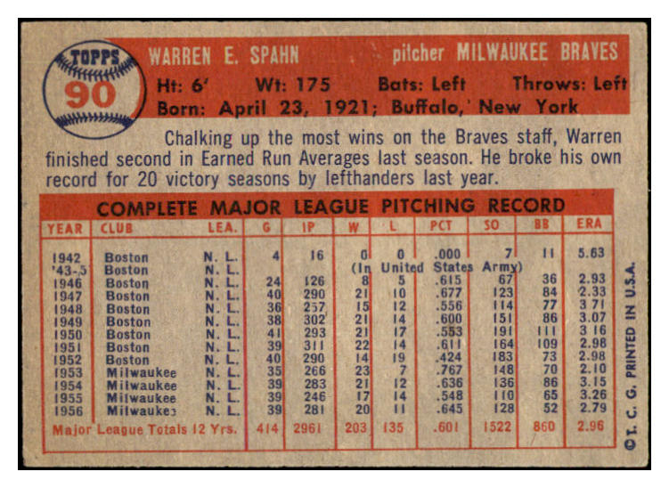 1957 Topps Baseball #090 Warren Spahn Braves EX 522425